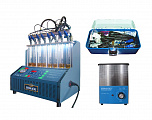Стенд для проверки и промывки 6 инжекторов в ультразвуковой ванне. Автоматический слив тестирующей жидкости. Работает от сжатого воздуха. Имитация работы форсунок происходит с помощью встроенного электронного блока управления форсунками. В комплект поставки входит ультразвуковая ванна объемом 2,0 литра с подогревом и мощностью генератора 60 ВТ.