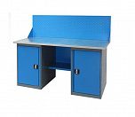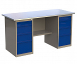 Верстак двухтумбовый поставляется в разобранном виде (4 элемента). Нагрузка на столешницу до 600 кг. Стандартный цвет: корпус - серый глянец RAL 7030, ящики и двери тумб - синий RAL 5017.  Размеры: 855x1400x700 мм. Масса: 78 кг.
