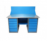 Верстак двухтумбовый поставляется в разобранном виде (4 элемента). Нагрузка на столешницу до 600 кг. Стандартный цвет: корпус - серый глянец RAL 7030, ящики и двери тумб - синий RAL 5017. Размеры:855x1400x700 мм. Масса: 107 кг.