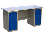 Верстак двухтумбовый поставляется в разобранном виде (4 элемента). Нагрузка на столешницу до 600 кг. Стандартный цвет: корпус - серый глянец RAL 7030, ящики и двери тумб - синий RAL 5017. Размеры:855x1400x700 мм. Масса: 111 кг.