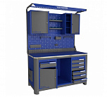 Нагрузка на столешницу 1500 кг. Столешница из листа влагостойкой фанеры марки ФСФ толщиной 40 мм и листом горячекатаной стали толщиной 5 мм. Рама верстака выполнена их холоднокатаной стали. Модуль верстака выполнен сварными. Ящики в модулях устанавливаются на шариковых телескопических направляющих полного выдвижения. Квадратная перфорация для установки крючков, держателей. Размеры: 1982x1993x743 мм.