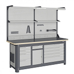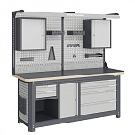 Нагрузка на столешницу 1500 кг. Столешница из листа влагостойкой фанеры марки ФСФ толщиной 40 мм и листом горячекатаной стали толщиной 5 мм. Рама верстака выполнена их холоднокатаной стали. Модуль верстака выполнен сварными. Ящики в модулях устанавливаются на шариковых телескопических направляющих полного выдвижения. Квадратная перфорация для установки крючков, держателей. Размеры: 1982x1493x743 мм.