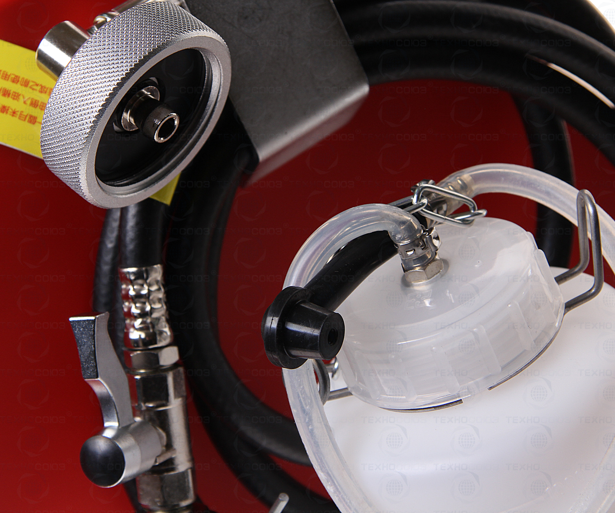 • Комплект включает стандартный изогнутый под прямым углом переходник европейского типа и литровую ёмкость для сбора отработанной тормозной жидкости.