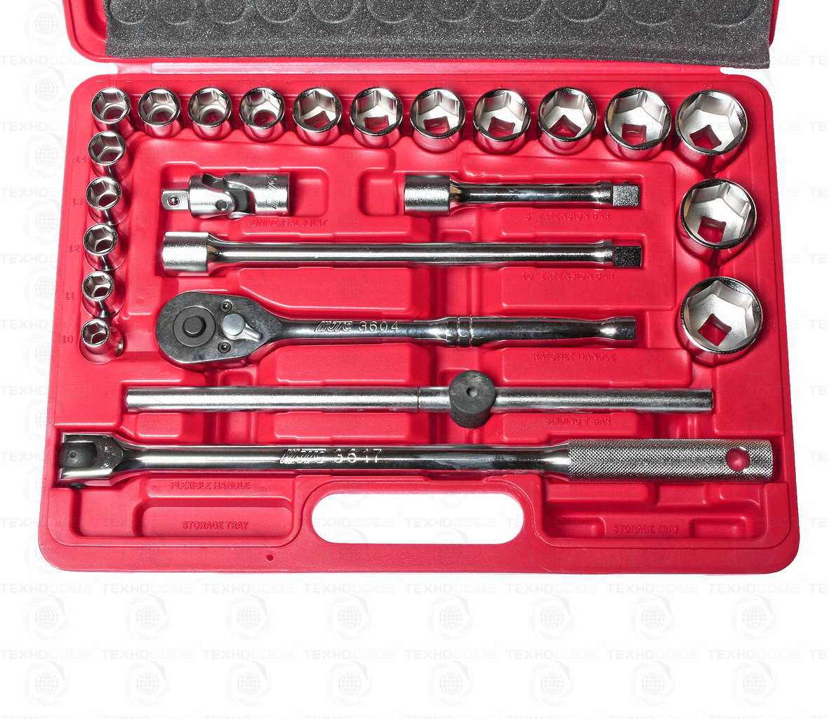 • 18 ед. головка 1/2: 10, 11, 12, 13, 14, 15, 16, 17, 18, 19, 21, 22, 23, 24, 27, 29, 30, 32 мм.