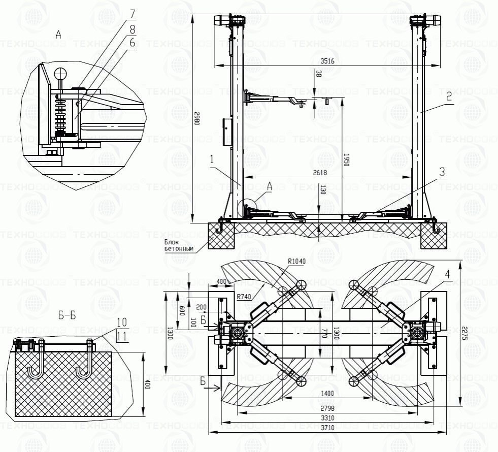 Подъемник ПЛД-3 устанавливается на бетонируемое в пол основание не входящее в комплект поставки и поставляемое по отдельному заказу. Подъемник ПЛД-3-01 комплектуется напольной рамой крепящейся к полу анкерными болтами. Анкерные болты поставляются по отдельному заказу и не входят в комплект поставки.