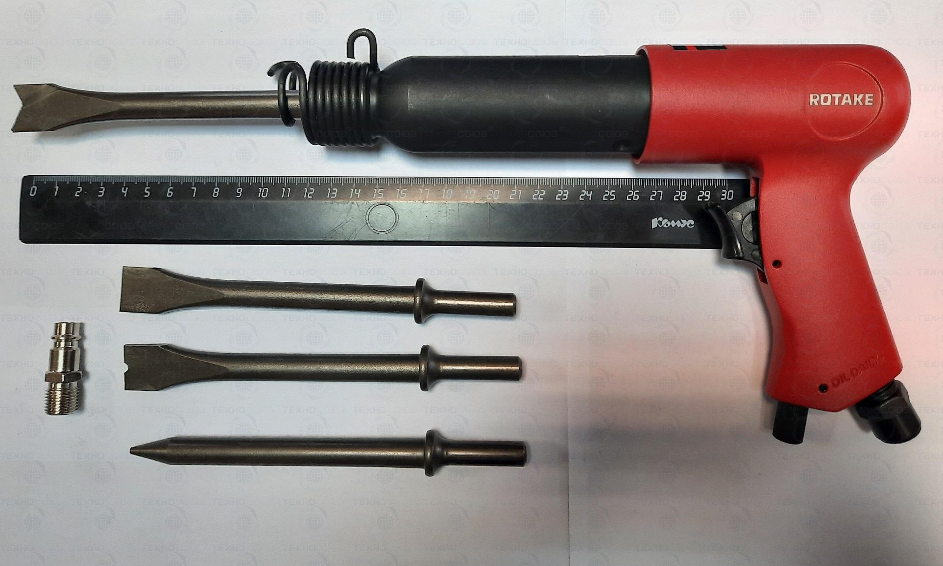 Пневмозубило с набором зубил (4шт.) Ход поршня 92мм. Частота ударов 2200уд/мин. Рекомендуется для резки металла толщиной до 2мм, для кузовных и шиномонтажных работ, удаления клёпок, срезки болтов, гвоздей и т.п. Также рекомендуется для отбойных и демонтажных работ по бетону.