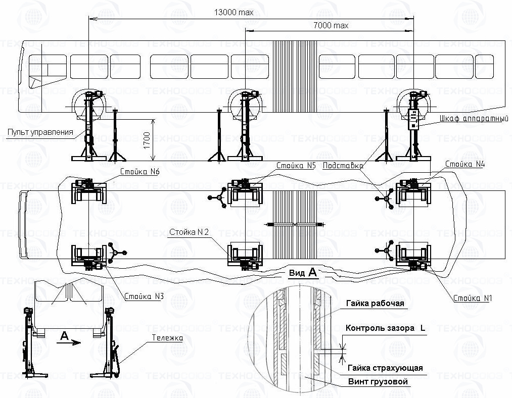 Подъемник состоит из шести стоек, каждая из которых имеет электромеханический привод, каретку, грузовой винт, рабочую и страхующую гайки, конечные выключатели верхнего и нижнего положения кареток. На первой стойке установлен шкаф аппаратный, имеющий корпус с панелью электрооборудования, автоматический выключатель, лампочку «Сеть», кнопки «Вверх» и «Вниз» для управления первой стойкой и кнопки «Вверх» и «Вниз» для управления всеми стойками одновременно.
