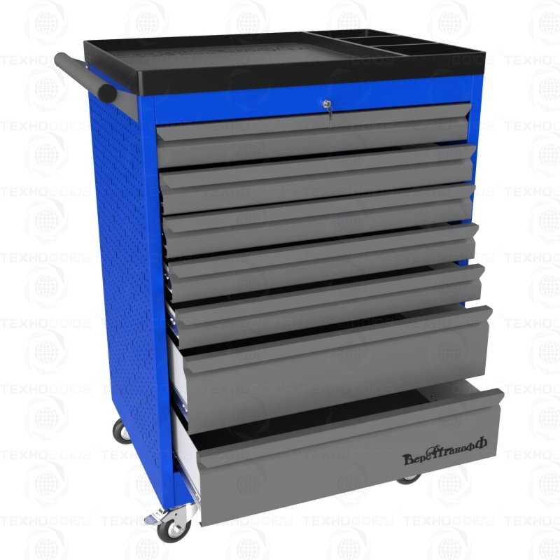 Тележки инструментальные серии PROFFI 950 предназначены для использования на предприятиях любого профиля занятых ремонтом и изготовлением различной продукции. На боковые стенки инструментальной тележки нанесена перфорация размером 25х25 мм и диаметром отверстия 8 мм, что позволяет устанавливать на них навесной инструмент или крючки. Наибольшей популярностью тележки инструментальные пользуются в сфере авторемонта и обслуживания автомобилей .Тележки имеют выдвижные ящики на шариковых телескопических направляющих полного выдвижения с фиксацией в закрытом положении, предотвращающее открывание при передвижении тележки. Ящики имеют центральный замок, который позволяет ограничить доступ посторонних лиц к содержимому ящиков. Тележка инструментальная изготовлена из высококачественного металла ведущих Российских производителей, покрашена порошковой краской производства Германии, имеет итальянскую и турецкую фурнитуру. Тележки для инструмента оснащены двумя не поворотными колесами диаметром 100 мм, одним поворотным и одним поворотным со стопором, которое фиксирует тележку и предотвращает непроизвольное скатывание.