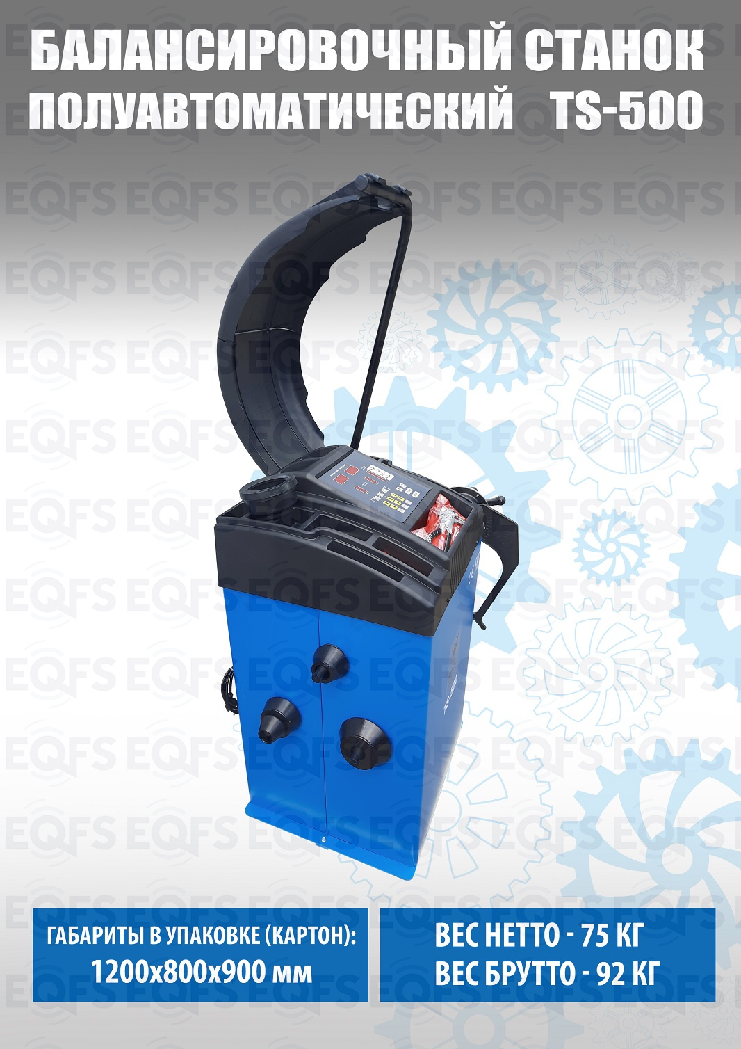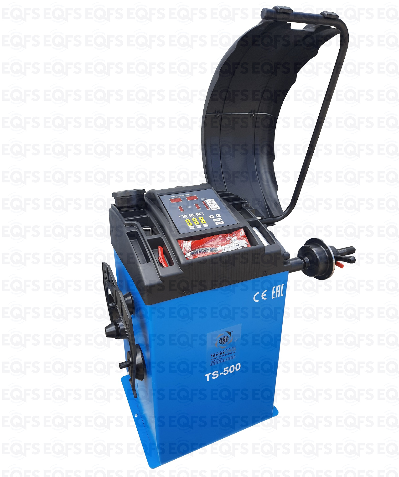 TS-500 Полуавтоматический балансировочный станок. В комплекте: кожух с автозапуском + клещи + кронциркуль + быстрозажимная гайка + набор конусов. Для колес диаметром до 760мм. Размеры диска: ширина 3–9” (76-228 мм) , диаметр колеса" - 10–21” (254-533 мм). Максимальный вес колеса с диском – 65 кг. C кожухом. Точность ±1гр. Напряжение 220В.