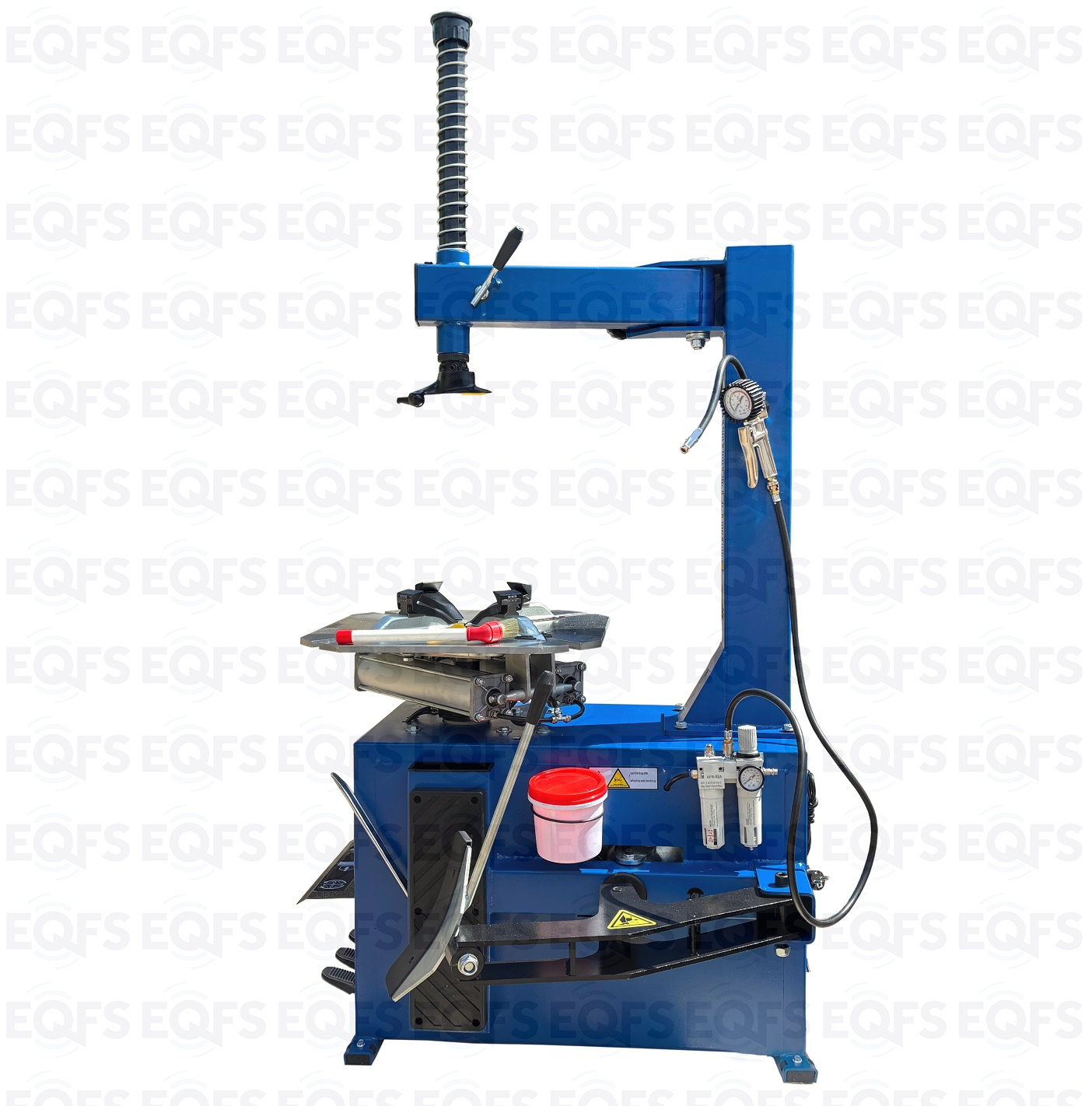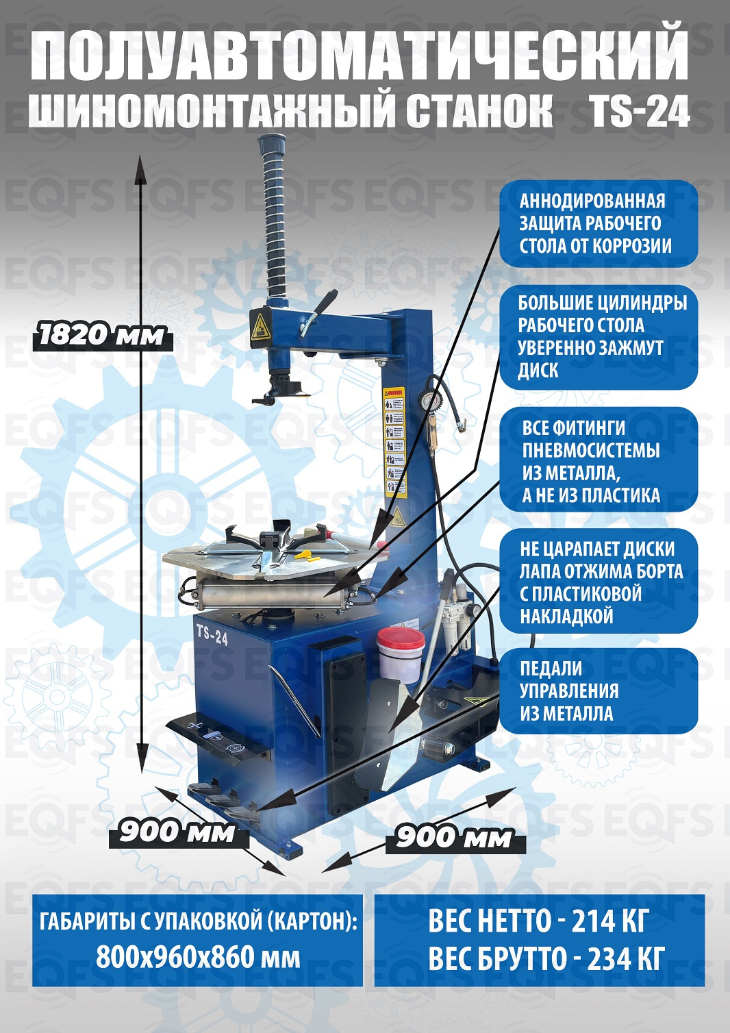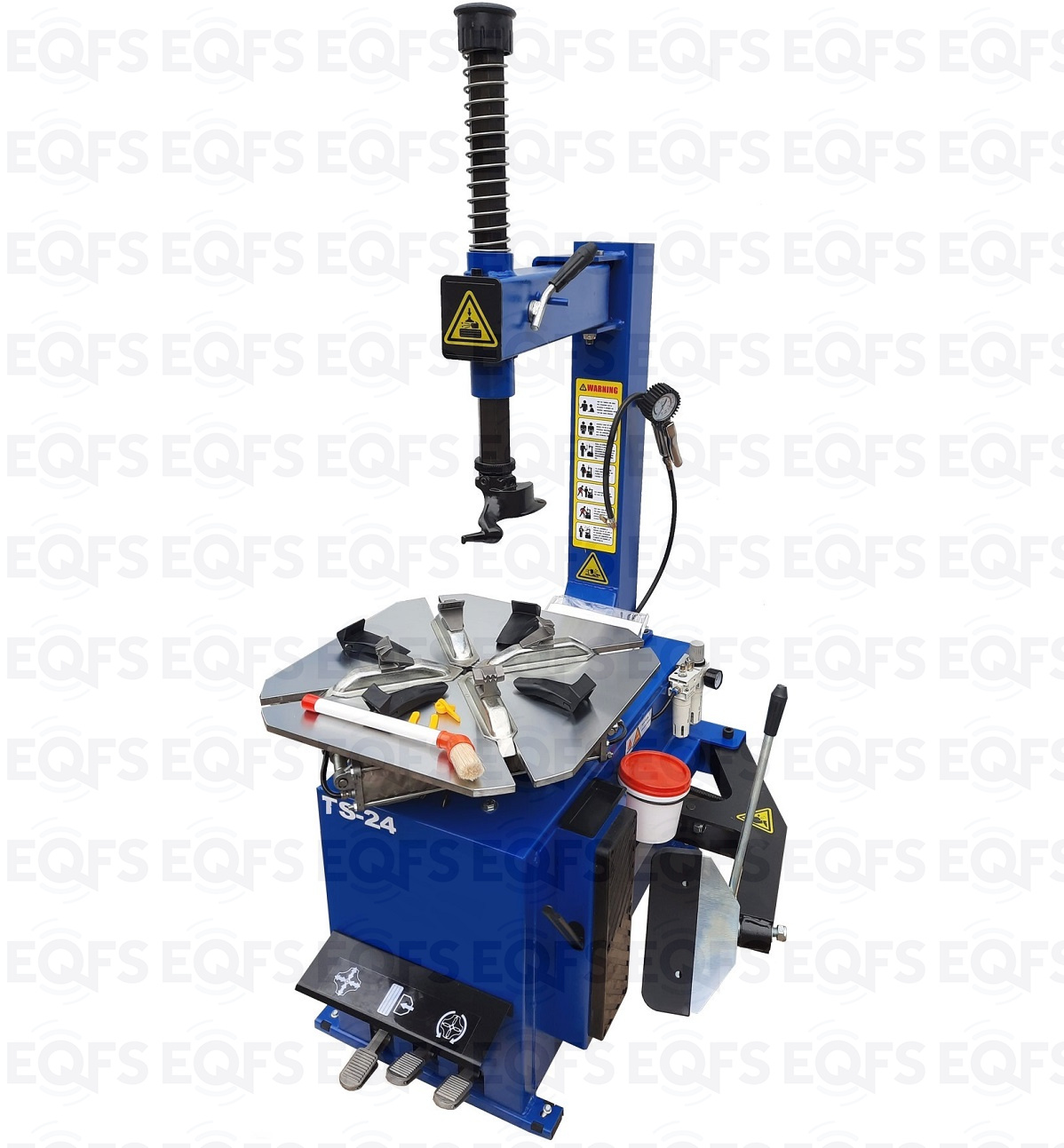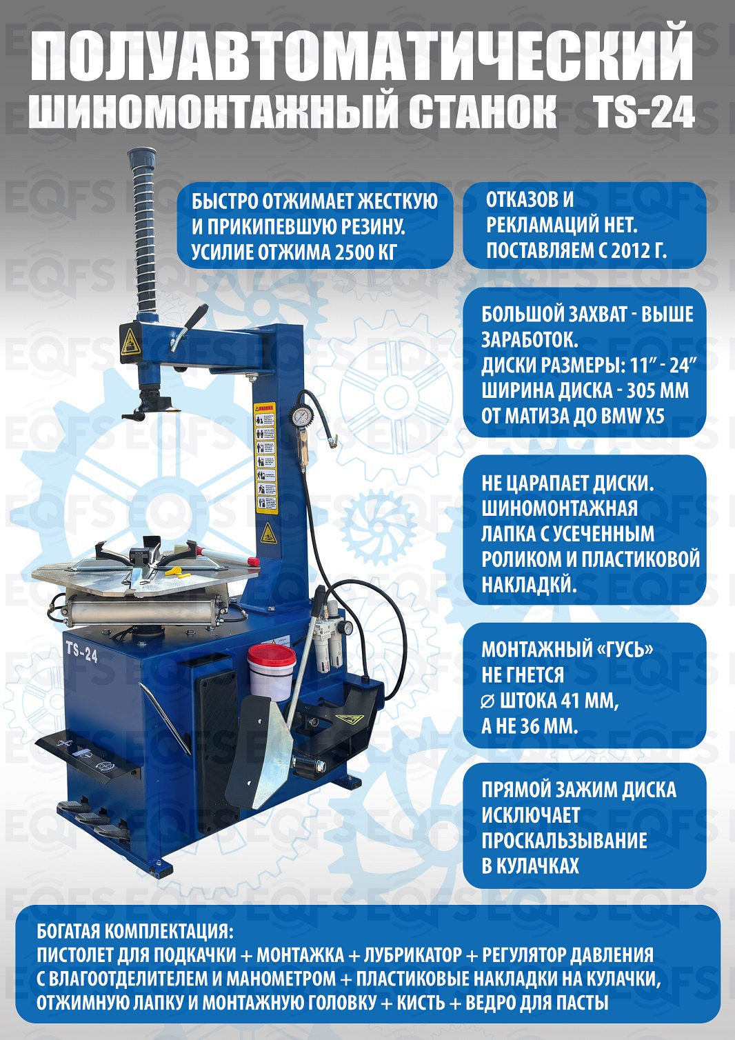TS-24 шиномонтажный станок. Полуавтоматический. Квадратный стол. Для дисков: внешний 11÷21”, внутренний 12÷24”. Усилие отрыва покрышки 2700 кг. В комплекте: пистолет для подкачки шин + монтажка + пластиковые накладки на зажимные кулачки + регулятор давления с влагоотделителем и манометром