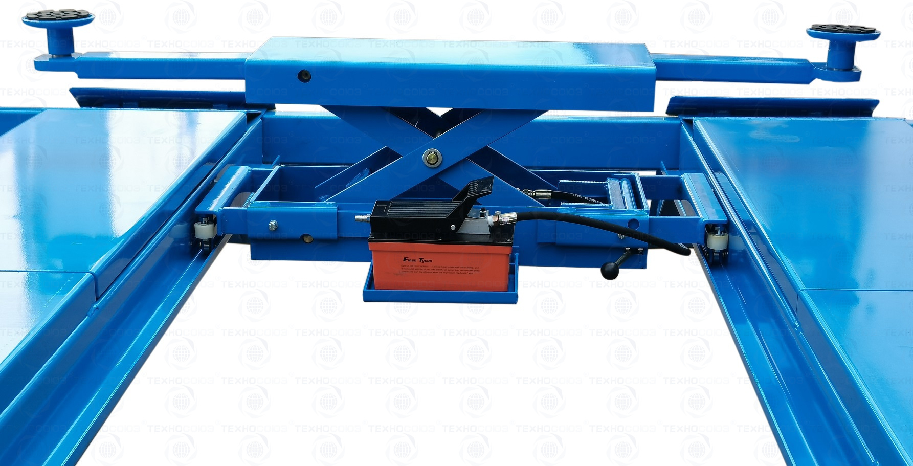 Пневматический привод насоса позволяет точно регулировать высоту подъема. Подъемник канавный снабжен стопорным механизмом, который предотвращает падение автомобиля во время проведения работ.